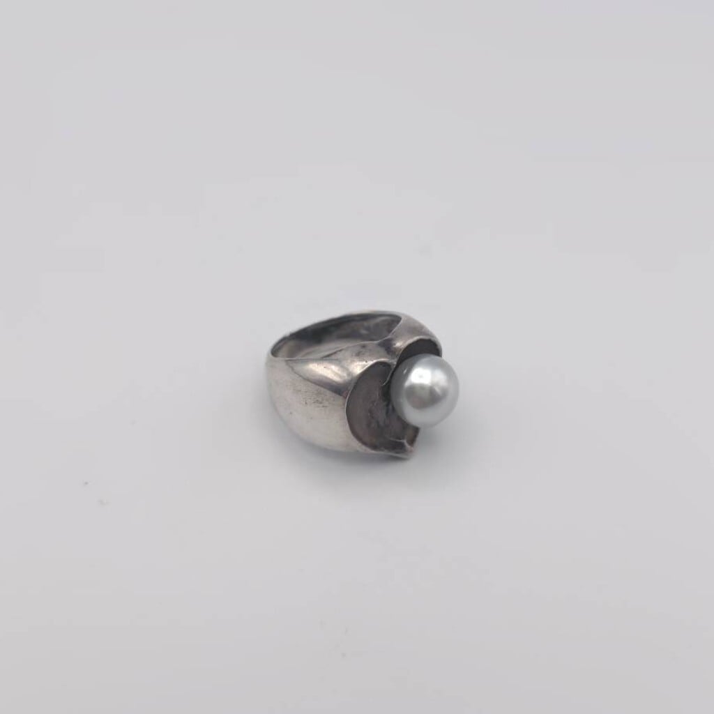 古美加工を施したリングに、シルバーブルーバロック真珠をあわせました