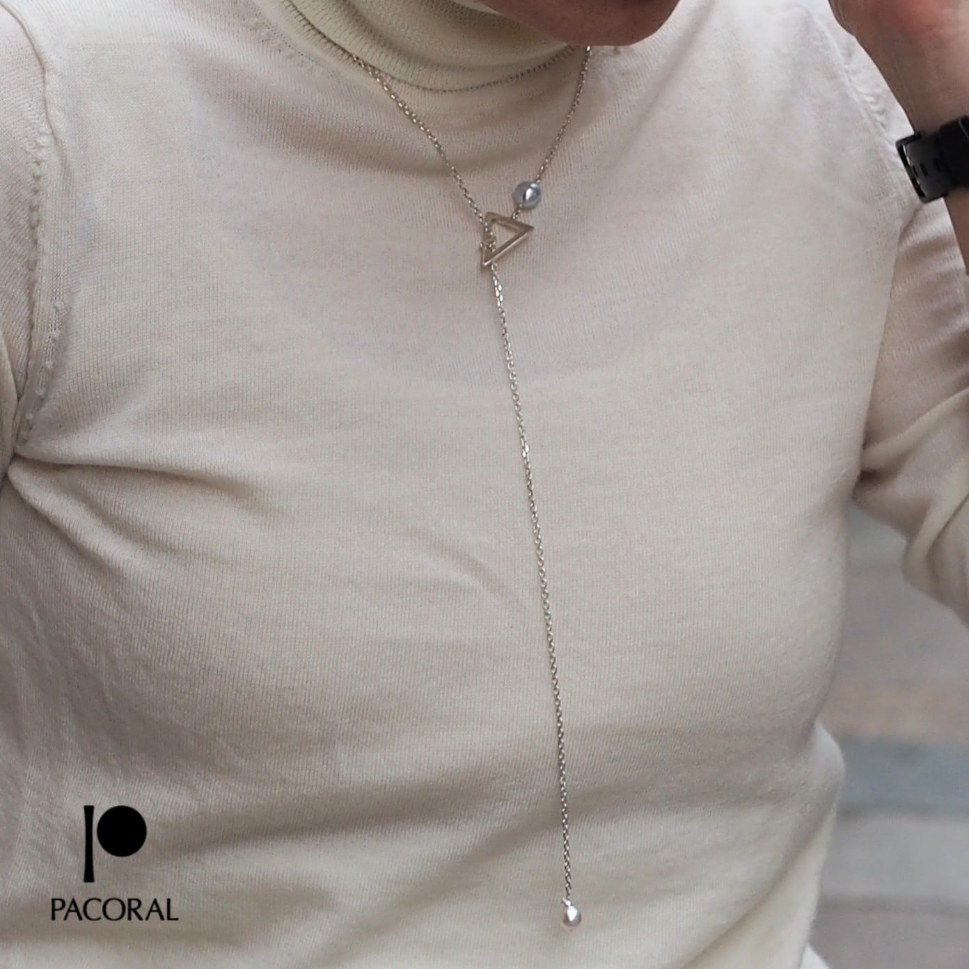 トライアングル型のモチーフに、先端のパールを通してお好きな位置で調節できます。