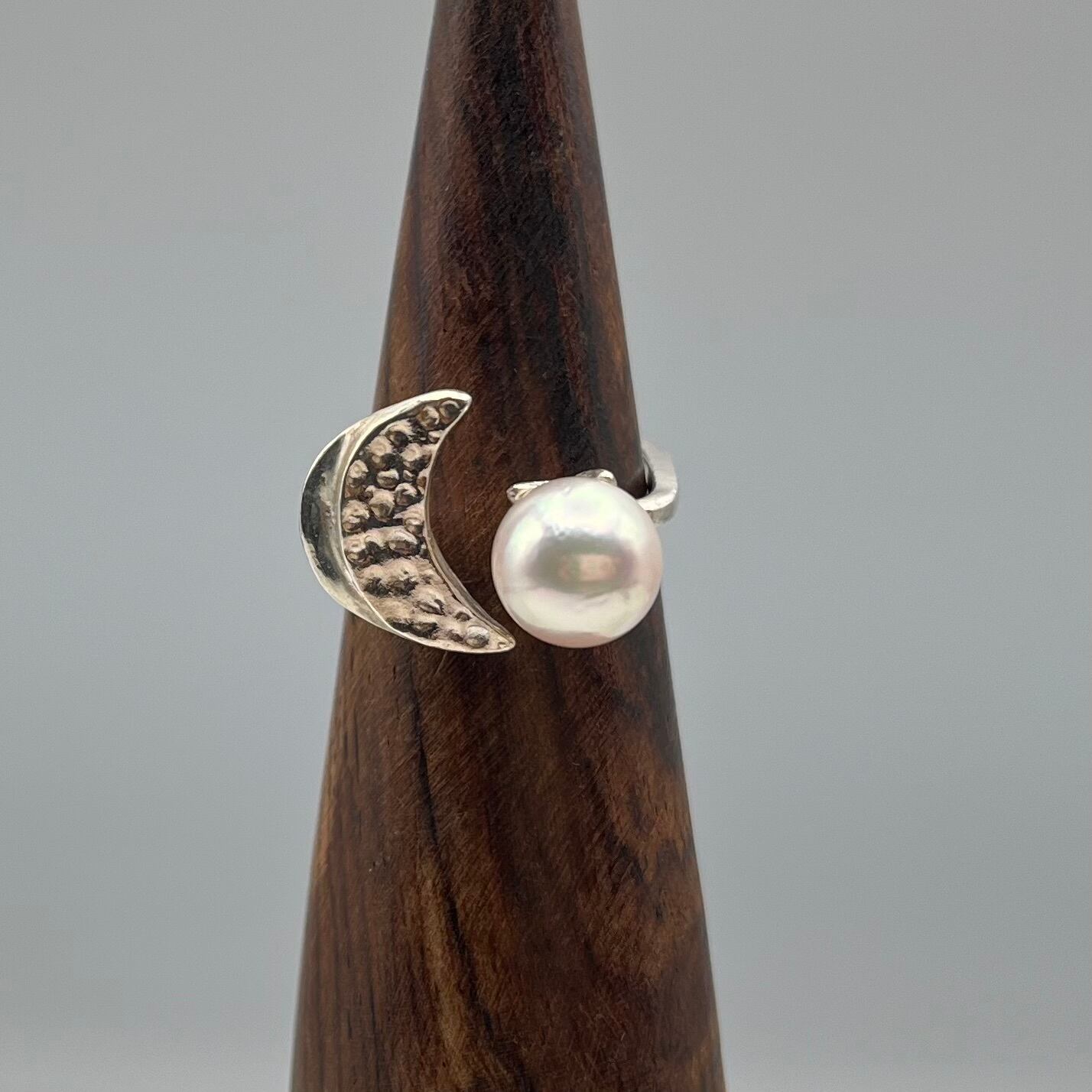 月の雫ともいわれる真珠は、月のパワーを秘めていると言われています。アコヤ真珠と月が向き合う神秘的な雰囲気が人気のリングです。フリーサイズでご自分の指にしっくり沿います。